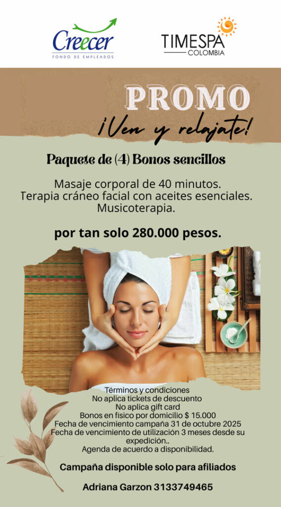Aprovecha nuestros Plan de SPA con un super descuento por estar asociado a Creecer. No dejes pasar esta oportunidad y regálate un tiempo de relajación.
