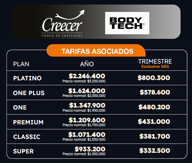 Con tu F.E. Creecer, puedes entrenar al mejor precio con Bodytech. Adquiere tu plan anual en la categoría que prefieras.
